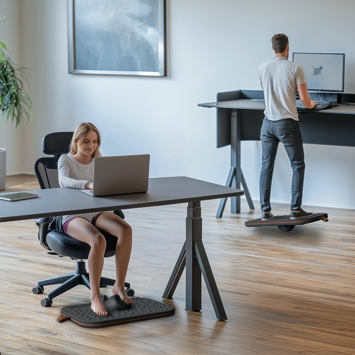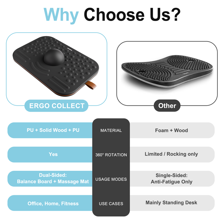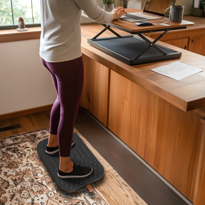 <p><b>Product Description:</b></p> <p>Upgrade your workspace or home training routine with this 2-in-1 Balance Board and Anti-Fatigue Mat — a patented design that delivers movement, comfort, and focus wherever you are.</p> <p>On one side, it functions as a 360° wobble balance board, perfect for active standing at your desk or improving core strength, stability, and posture during workouts. Flip it over and you get a textured anti-fatigue massage mat, designed to stimulate your feet and arches for all-day relief, whether you’re barefoot in the home office or recovering after training.</p> <p>Built with a durable PU top and bottom and a solid wood core, this board offers long-lasting support and up to 350 lbs weight capacity. The dual-sided construction not only extends the product’s usability but makes it ideal for alternating between movement and rest.</p> <p>With its portable leather handle, you can easily carry it between the office, living room, or gym. Whether you're at a standing desk, in a fitness class, or simply watching TV, this balance trainer helps you stay active, alert, and comfortable.</p>