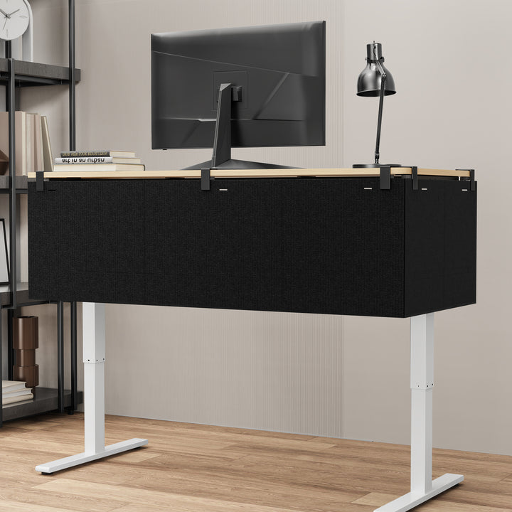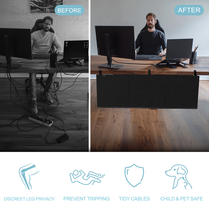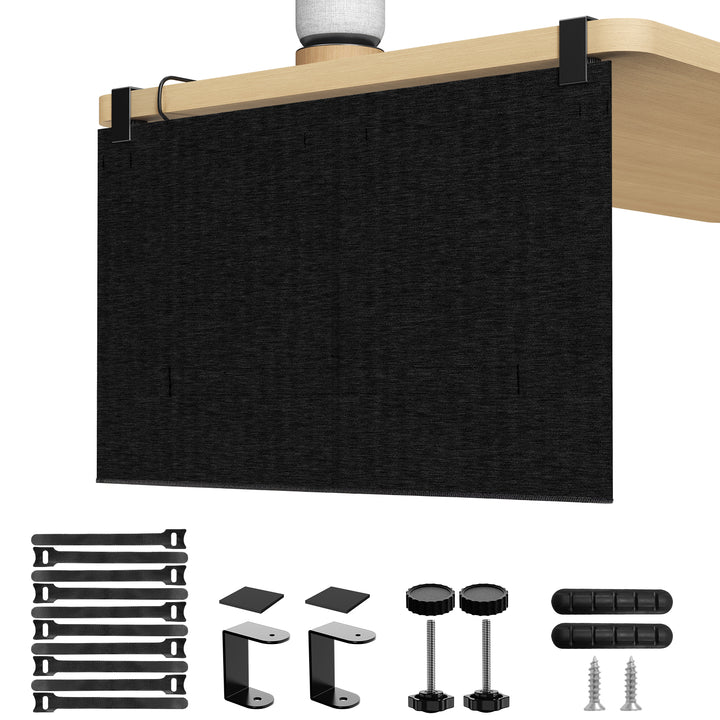 <p>Whether you're in a home office, corporate environment, or shared workspace, this felt panel creates a cleaner, more professional appearance while promoting safety. It reduces tripping hazards and keeps loose wires safely away from children and pets. The durable black felt material blends seamlessly with modern furniture and installs easily with adjustable clamps or screws, fitting most desks without the need for tools.</p>